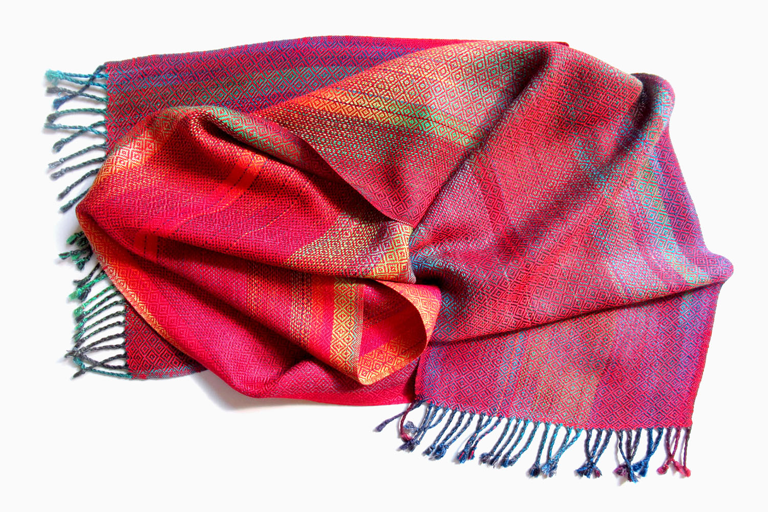 Die ungewöhnlichen Farbeffekte der Tücher erreiche ich durch das Färben der Kettfäden. In der Längsrichtung des Gewebes werden die auffallenden Kolorierungen sichtbar. Der einfarbige Schussfaden trifft auf verschiedene Farbtöne, es entstehen immer neue harmonische Farbkombinationen in fließenden Übergängen.