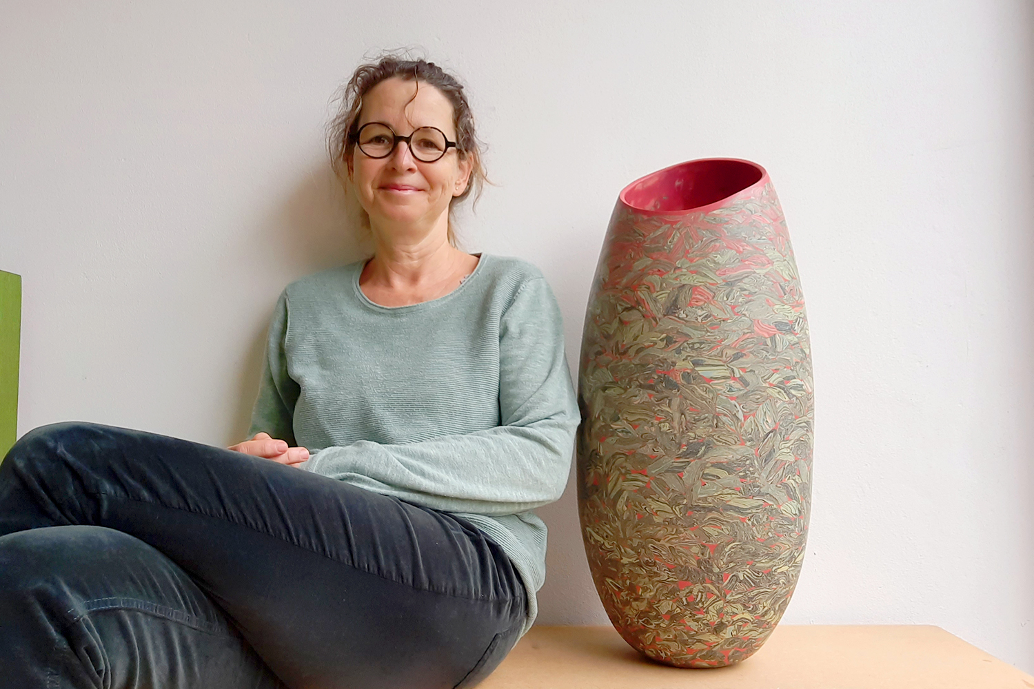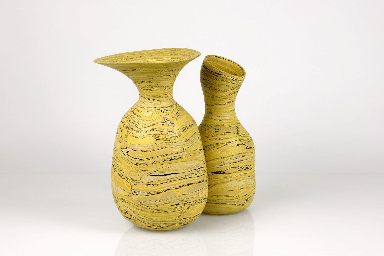 Aus eingefärbten Ton- und Porzellanmassen in streifigen Schichten, Parzellen und Marmorierungen frei von Hand gebaut, zeigen die reduzierten Gefäßformen einzigartig gewachsene Zeichnungen an ihrer Außenwandung. Formen und Farbmusterung laden ein zur Berührung, die vielfach geschliffene steinig harte Oberfläche überrascht durch Weichheit und Glätte.