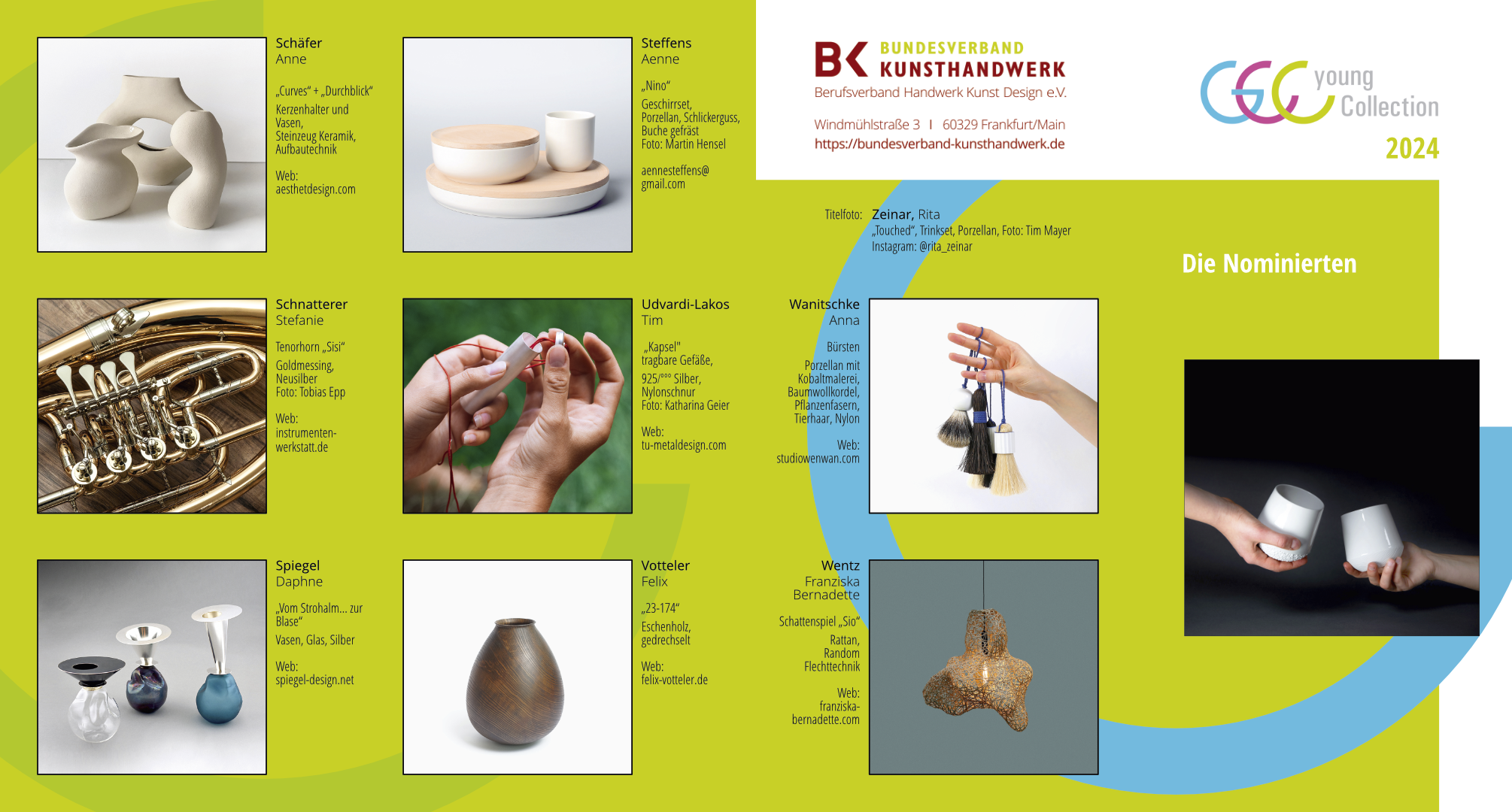 Die Young Collection des Bundesverbandes Kunsthandwerk e.V. präsentiert kreative Schöpfungen junger Kunsthandwerker*innen und Designer*innen und setzt damit einen Fokus auf die Vielfalt, die Kreativität und das Können der jungen Generation. Eine Fachjury hat aus der Vielzahl der Bewerbungen die 20 Nominierten ausgewählt, deren Arbeiten in der Handwerksform Hannover präsentiert wurden. Die Kollektion bietet einen hervorragenden Blick auf die Kreativität und Leistungskraft der jungen Nachwuchskräfte, die kunsthandwerklich und designorientiert tätig sind. Drei der 20 Designer*innen wurden mit einem Sonderpreis des Bundesverband Kunsthandwerk ausgezeichnet: Nicholas Plunkett, Designer, Porzellan aus Berlin Daphne Spiegel, Gold- und Silberschmiedin aus Sulzthal Anna Wanitschke, Produktdesignerin, Porzellan, Keramik, Glas aus Leipzig |