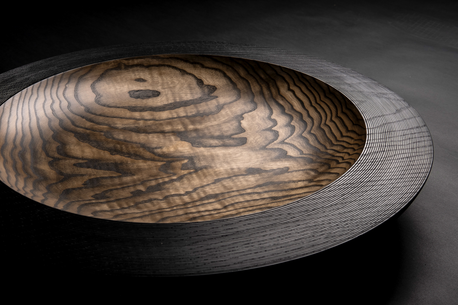 Ein spannender Dialog entsteht aus den dichten, feinen Rillen, die einzeln mit dem Meisel in die massive Außenwand gestochen wurden, versehen mit einer aufwendigen Lacktechnik schimmern geheimnisvoll die Jahresringe des Holzes hervor.