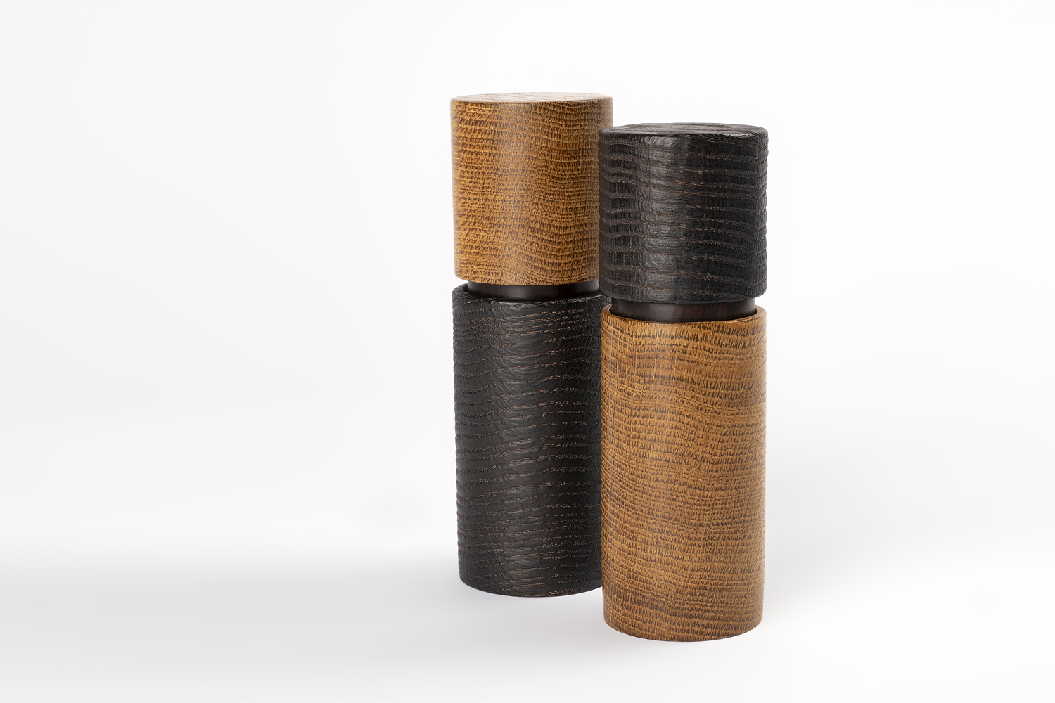 Einen weiteren Schwerpunkt meiner Arbeit habe ich in der Behandlung von Eiche mit Feuer gefunden. Die Jahresringe treten dabei dreidimensional hervor und erlauben einen tiefen Einblick in die Seele des Holzes. Ich kombiniere die schwarz gebrannte Oberfläche gern mit fein geschliffenen Flächen oder feinen Metallen.