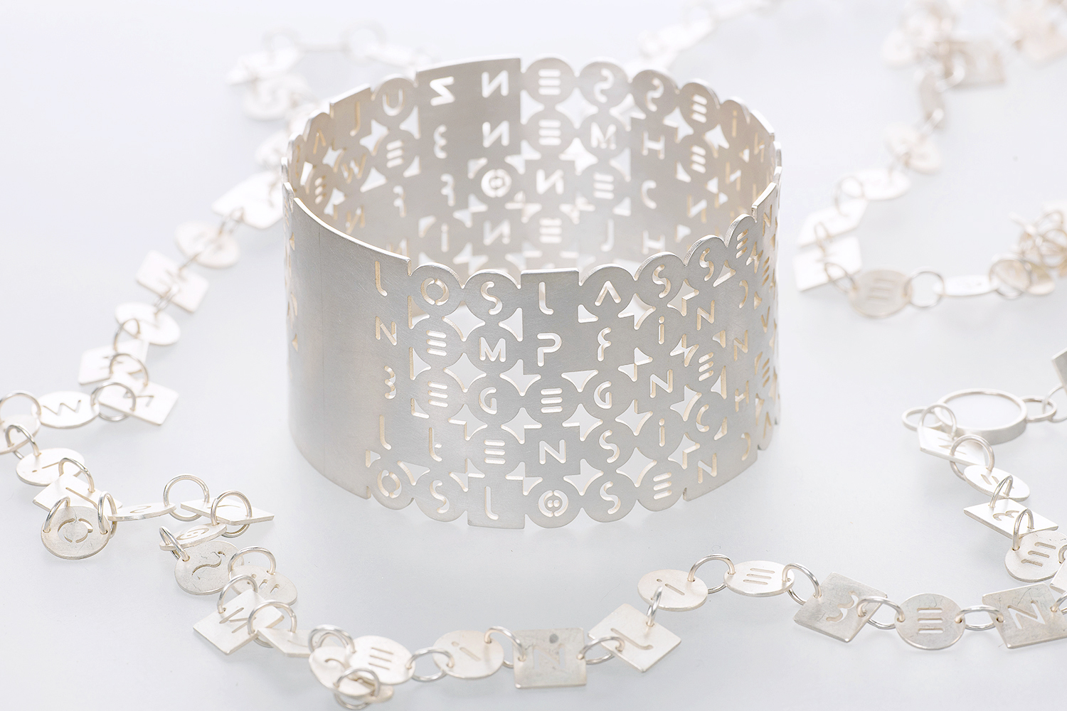 Ein weiteres Thema der Produkt-Designerin sind handgravierte Texte, die sie in ihren Schmuck und in ihre Wandbilder einarbeitet. Mit Hilfe von verschiedenen Drucktechniken werden die aus der Handgravur entstandenen Texturstrukturen zu atmosphärisch dichten Textbildern gestaltet, die die Poesie ihrer Worte deutlich machen.